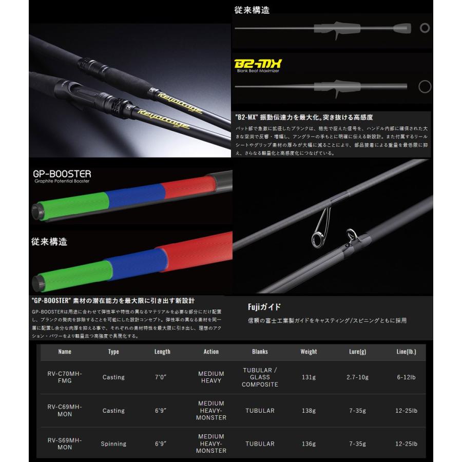 商品情報 納期:2〜4日予定(土日祝水曜を除く)お取寄せでのご発送 【RV-C70MH-FMG】 ブランクにグラスマテリアルをブレンドしたソフトなティップは水面のルアーを引っ張り過ぎず狙ったスポットでよりスローにアクションさせられると同時に、ついばむようなバイトを弾かずに吸い込ませるのに有効。ベリー・バットは太軸フックで魚の口を貫く張りとパワーを持たせたトルクフルな設計。マグナムトップウォータープラグのみならず、ピンポイントを狙い打つようなテクニカルビッグベイトゲームでも威力を発揮します。 Type:Casting Length:7.0ft Action:MEDIUM HEAVY Blanks:TUBULAR / GLASS COMPOSITE Weight:131g Lure:2.7-10g Line:6-12lb Piece:1ピース |